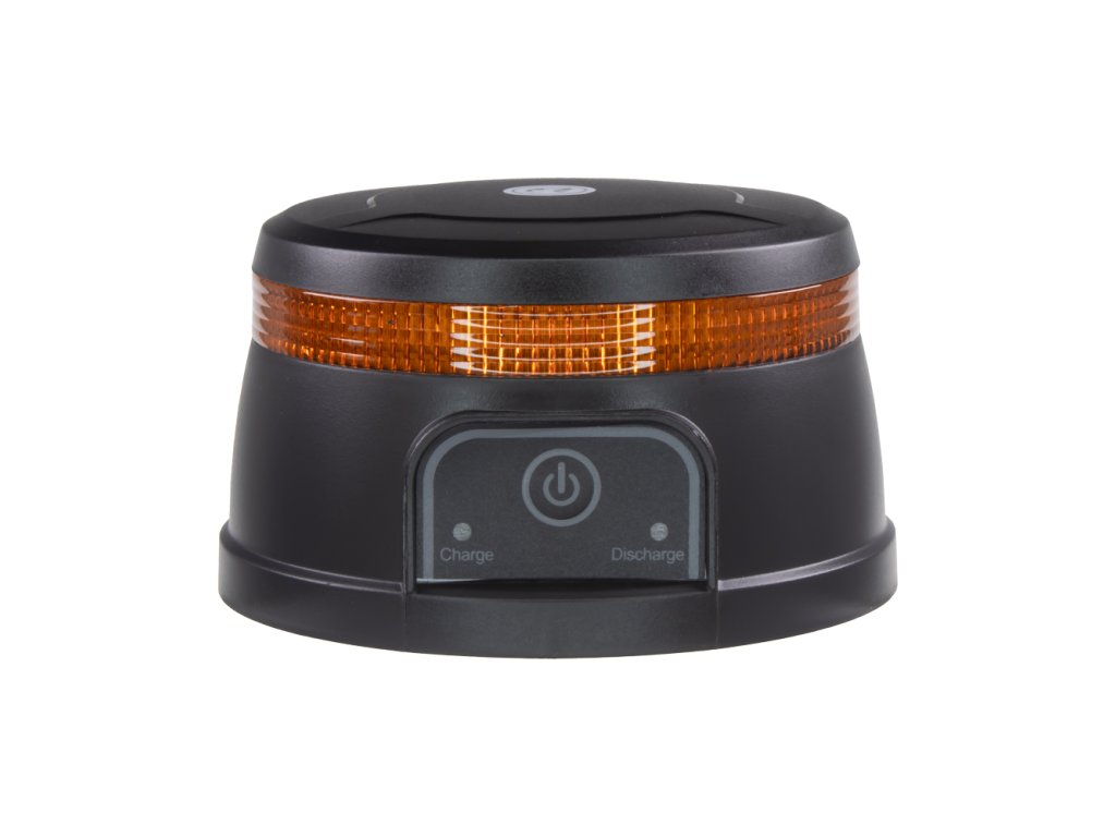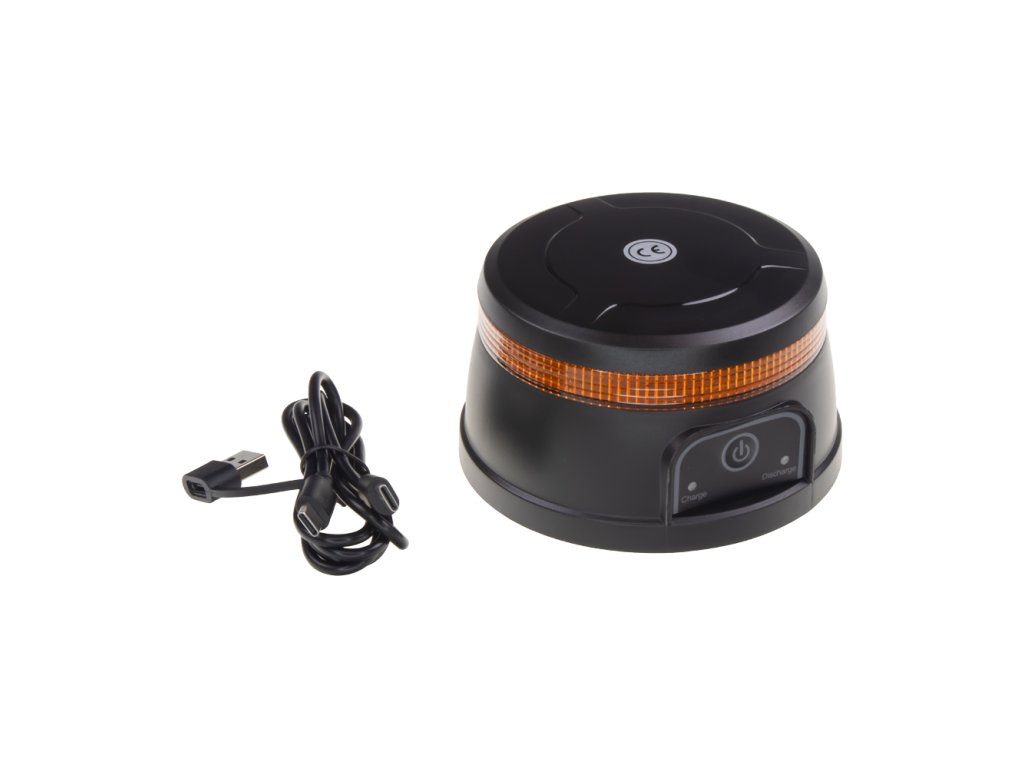 Akumulátorový nabíjecí výstražný oranžový maják s LED technologií a zábleskovým / otočným režimem. Určen pro uchycení pomocí magnetu.