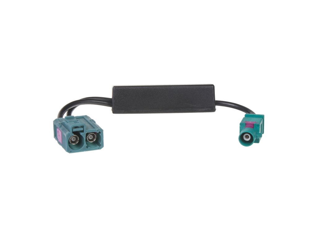 Anténní adaptér double FAKRA samice/1x FAKRA samec - slouží např. pro připojení 2DIN OEM VW autorádií a navigací (s dvojitým FAKRA konektorem) do vozidel, v kterých je pouze 1 anténa (1x fakra konektor)