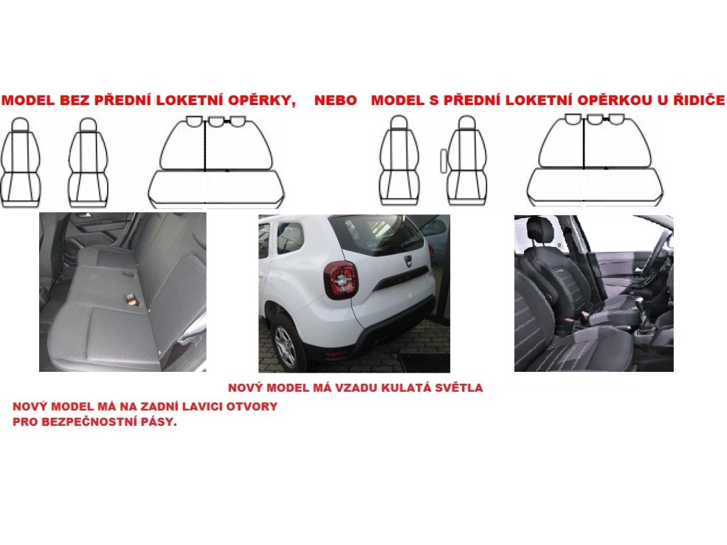 Autopotahy DACIA DUSTER II, od r. 2018. Autopotahy na míru DACIA DUSTER II, od r. 2018. Zadní opěradlo DĚLENÉ za spolujezdcem, zadní lavice nedělená s otvory pro zapnutí pásů, kapsy, 5 opěrek hlavy. POZOR !!! ŘIDIČ MŮŽE, ALE NEMUSÍ MÍT PŘEDNÍ LOKETNÍ OPĚRKU. PROSÍME O INFORMACI DO POZNÁMKY. V ROCE 2018 SE VYRÁBĚL JEŠTĚ PŘEDEŠLÝ MODEL. POKUD V ZADNÍ LAVICI MÁTE OTVORY PRO UCHYCENÍ PÁSU- MÁTE NOVÝ MODEL. POKUD V LAVICI OTVORY NEJSOU MÁTE V AUTĚ SEDAČKY Z PŘEDEŠLÉHO MODELU –DACIA DUSTER I.