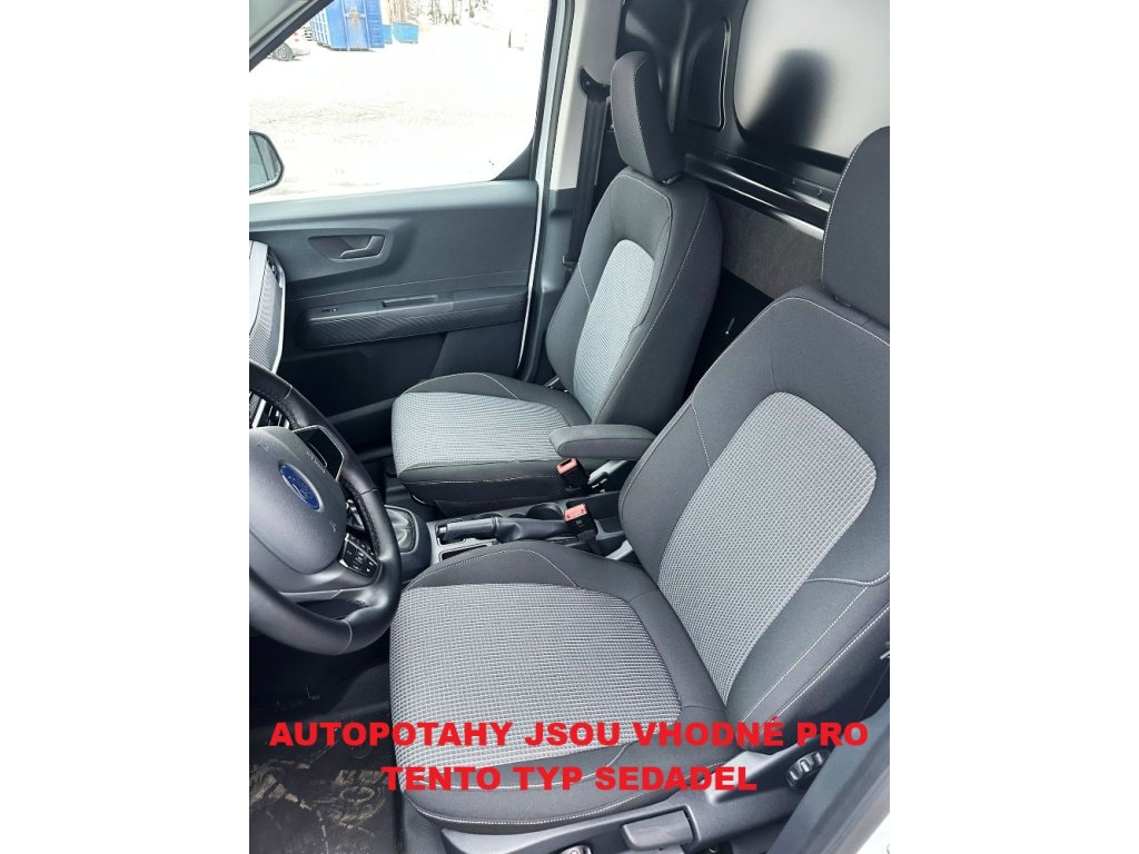 Autopotahy na míru FORD TRANSIT COURIER II, 2 MÍSTA, od r. 2023. Autopotahy na míru na FORD TRANSIT COURIER II, 2 MÍSTA, od r. 2023. Toto zboží se vyrábí na zakázku, kde dodací lhůta může být 30 dní i více. Sedadlo řidiče a spolujezdce. Loketní opěrka v opěradle řidiče, 2 opěrky hlavy, airbagy.