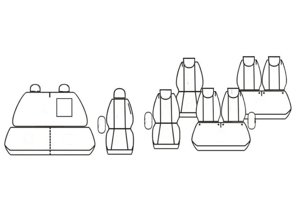 Autopotahy Ford Transit Custom, 9 míst, samostatné opěradla ve 2 a 3 řadě, r. v. 2012-2023 1. ŘADA: Opěradlo a sedadlo řidiče s loketní opěrkou + dvojopěradlo spolujezdců se stolkem a otvorem na pásy, dvojsedadlo dělené napůl, 3 opěrky hlavy. 2. ŘADA: 1x Samostatné sedadlo a opěradlo s otvorem na pásy a nedělená dvojlavice s otvory na pásy a isofixy, 3 opěrky hlavy opěradlo dělené. Vhodné pro model který má loketní opěrky v druhé řadě, nebo bez. 3. ŘADA: 1x Samostatné sedadlo a opěradlo s otvorem na pásy a nedělená dvojlavice s otvory na pásy a isofixy, 3 opěrky hlavy opěradlo dělené.