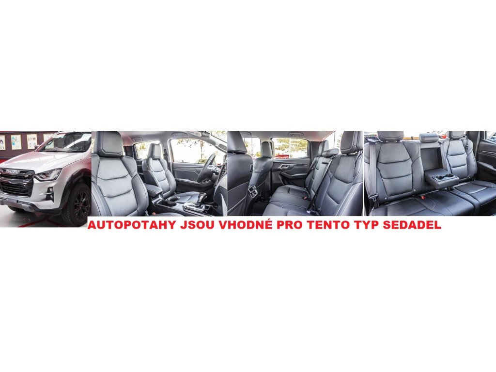 Autopotahy ISUZU D-MAX III RG, od r. 2020. VYROBENO ZE ZÁTĚŽOVÉ LÁTKY !!! Přesné autopotahy ISUZU D-MAX III RG, od r. 2020. Přední sedadla s airbagy, kapsy, přední loketní opěrka, zadní sedadlo dělené za řidičem, zadní loketní opěrka, 5 opěrek hlavy. VYROBENO ZE ZÁTĚŽOVÉ LÁTKY !!!