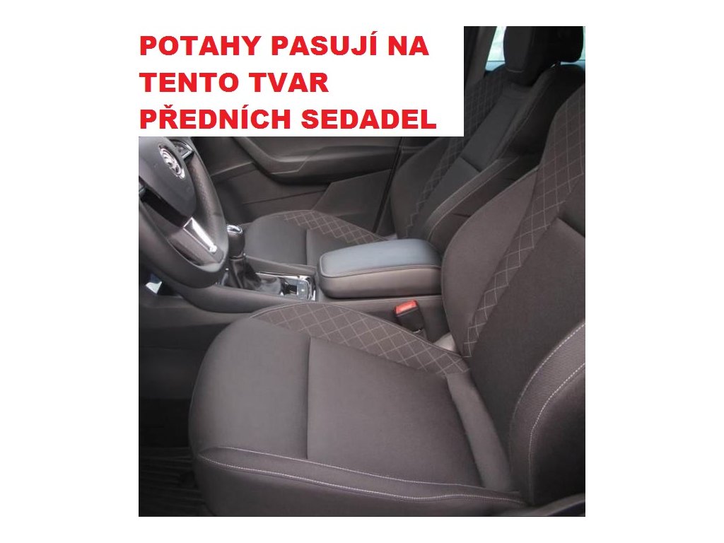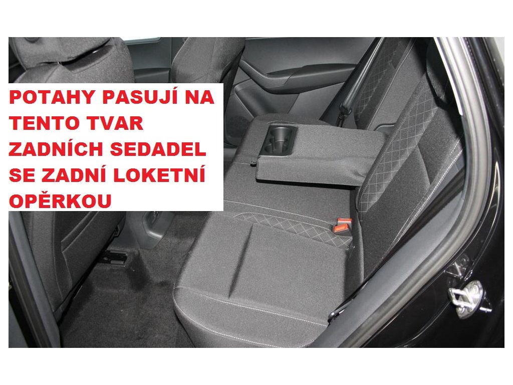 Autopotahy ŠKODA KAROQ, DĚLENÉ ZADNÍ OPĚRADLO, SE ZADNÍ LOKETNÍ OPĚRKOU, Eko kůže Autopotahy na míru ŠKODA KAROQ, DĚLENÉ ZADNÍ OPĚRADLO, SE ZADNÍ LOKETNÍ OPĚRKOU. Přední sedadla s airbagy, opěrky hlavy vyndávací na tyčkach, kapsy, přední loketní opěrka ve středovém panelu, páčky na seřizování bederních opěrek na předních opěradlech. ZADNÍ OPĚRADLO DĚLENÉ ZA ŘIDIČEM SE ZADNÍ LOKETNÍ OPĚRKOU, ZADNÍ LAVICE NEDĚLENÁ. Isofixy, otvor pro 3 bodové pásy, otvory pro sklápění opěradel.