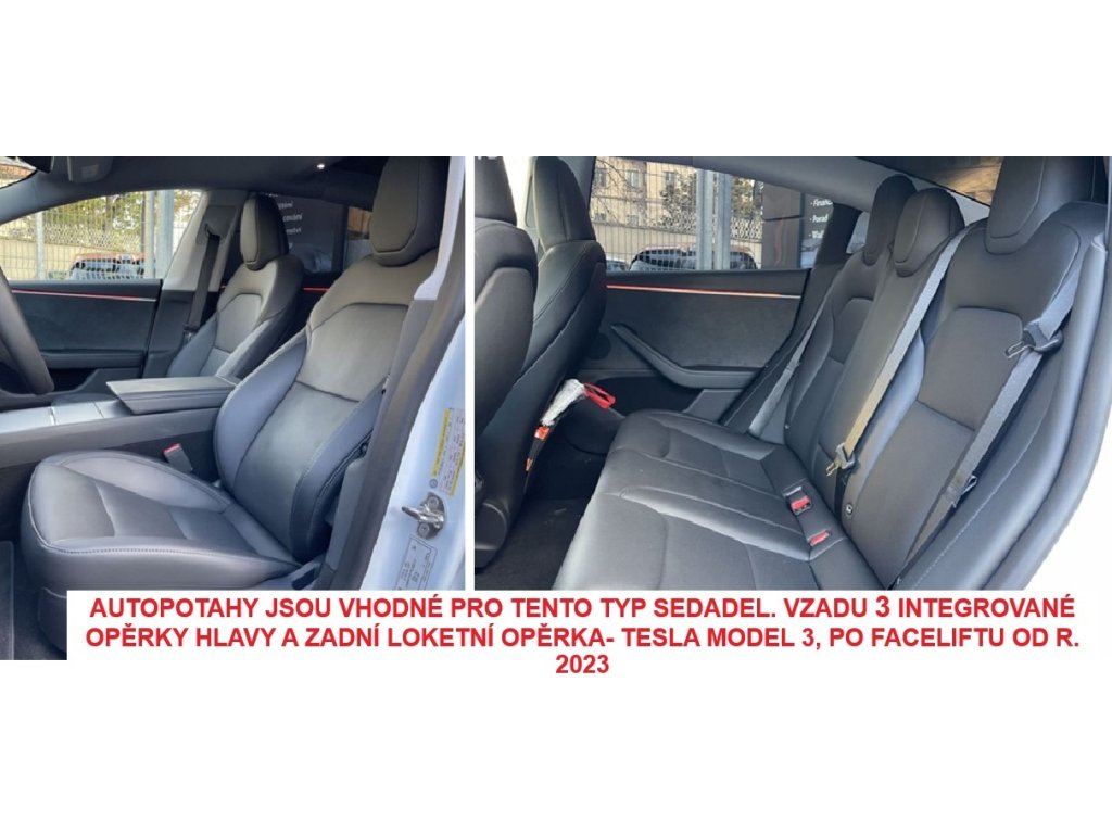 Autopotahy na míru TESLA MODEL 3 II, od r. 2023. Autopotahy na míru na TESLA MODEL 3 II, od r. 2023. Toto zboží se vyrábí na zakázku, kde dodací lhůta může být 30 dní i více. 1. Přední sedačky s integrovanýmí opěrkami hlavy. 2. Zadní opěradlo dělené za spolujezdcem, zadní loketní opěrka, 3 integrované- nevyndavací opěrky hlavy, kryty podběhů. 3. Přední loketní opěrka. Kvalitní, silné autopotahy z čalounické látky včetně zadní části zadních opěradel v zavazadlovém prostoru. Silné polstrování, laminovaná spodní vrstva textilního materiálu. Potahy lze prát na 30°, velmi snadná montáž. Autopotahy šite na míru dokonale pasují, a silná laminace autopotahy zpevňuje a zabraňuje sklouzávání potahů ze sedadel. Sada autopotahů na celé auto včetně povlaků hlavových opěrek. Vhodné pro auta s bočními airbagy, ale lze použít i pro auto, které boční airbag nemá (speciální šev). VYROBENO v EU. NOVINKA NA TRHU - ZAVÁDĚCÍ CENA! Zboží je atestováno - ATEST 8SD.