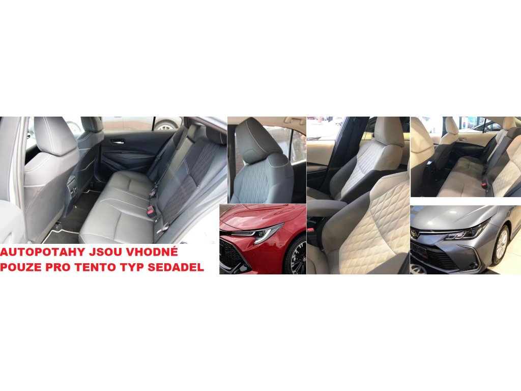 Autopotahy Toyota COROLLA XII, SEDAN, od r. 2019. Autopotahy na míru TOYOTA COROLLA XII, SEDAN, od r. 2019. POZOR- BUDEME POTŘEBOVAT INFORMACI, ZDA MÁTE HYBRIDOVOU, NEBO OBYČEJNOU VERZI !!! ROZDIL V ZADNÍ LAVICI. Zadní opěradlo dělené za řidičem, prostřední díl tvoří loketní opěrka. Zadní středová opěrka hlavy je nevyndávací a je integrovaná v opěradle. Dvě krajní zadní opěrky hlavy jsou vyndávací. Zadní lavice je nedělená s isofixy. Kapsy, přední loketní opěrka. Podívejte se prosím do fotogalerie a důkladně porovnejte fotky s interiérem vašeho auta. Je více variant interiéru. Ideální je poslat fotky z důrazem na tvar horní části předních opěradel a horní části zadních opěradel + info, zda je to hybrid, nebo ne.