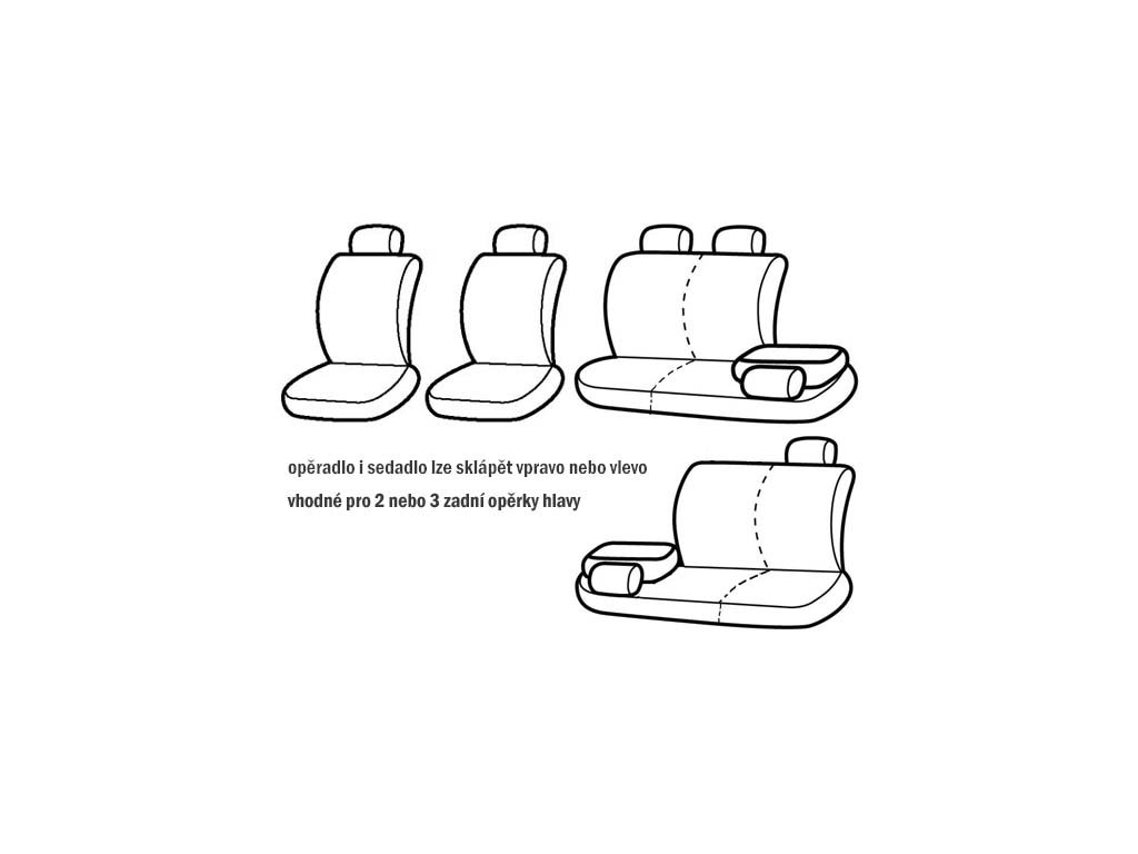 Zadní opěradla a sedadla jsou vybavená zipy vždy v jedné třetině pro snadnější manipulaci při sklápění. Lze použít pro zadní opěradlo s třemi opěrkami hlavy. Balení tedy obsahuje pět opěrek hlavy . Velmi snadná montáž, dokonale sedí i na anatomicky tvarovaných sedadlech. Snadná údržba - stačí otřít vlhkým hadříkem. Zboží je atestováno - ATEST 8SD. Sada autopotahů na celé auto včetně povlaků hlavových opěrek. Vhodné pro auta s bočními airbagy, ale lze použít i pro auto, které boční airbag nemá (speciální šev ) VYROBENO V EU !!!