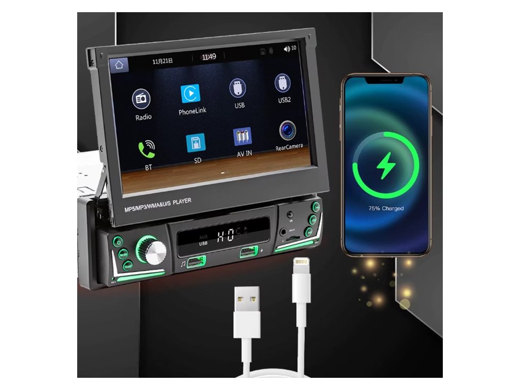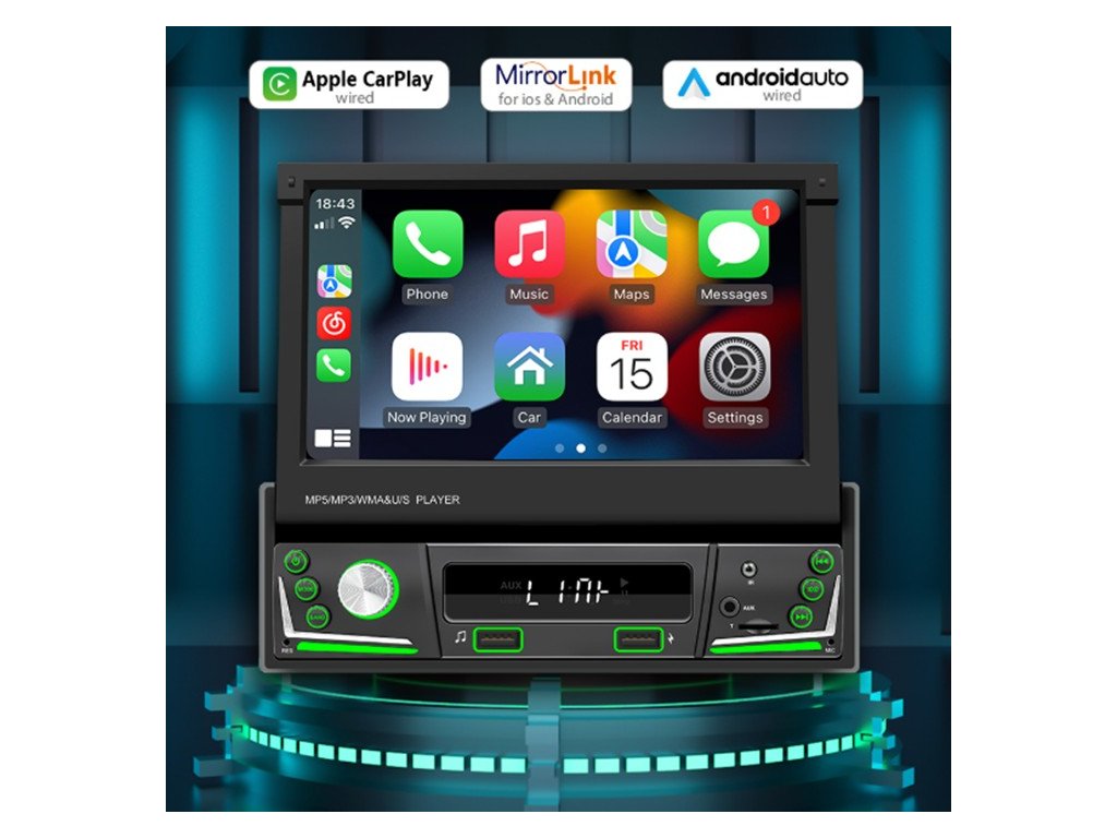 1DIN autorádio s výsuvným 7" LCD / 3x USB / Bluetooth / CarPlay / AndroidAuto / Mirrorlink