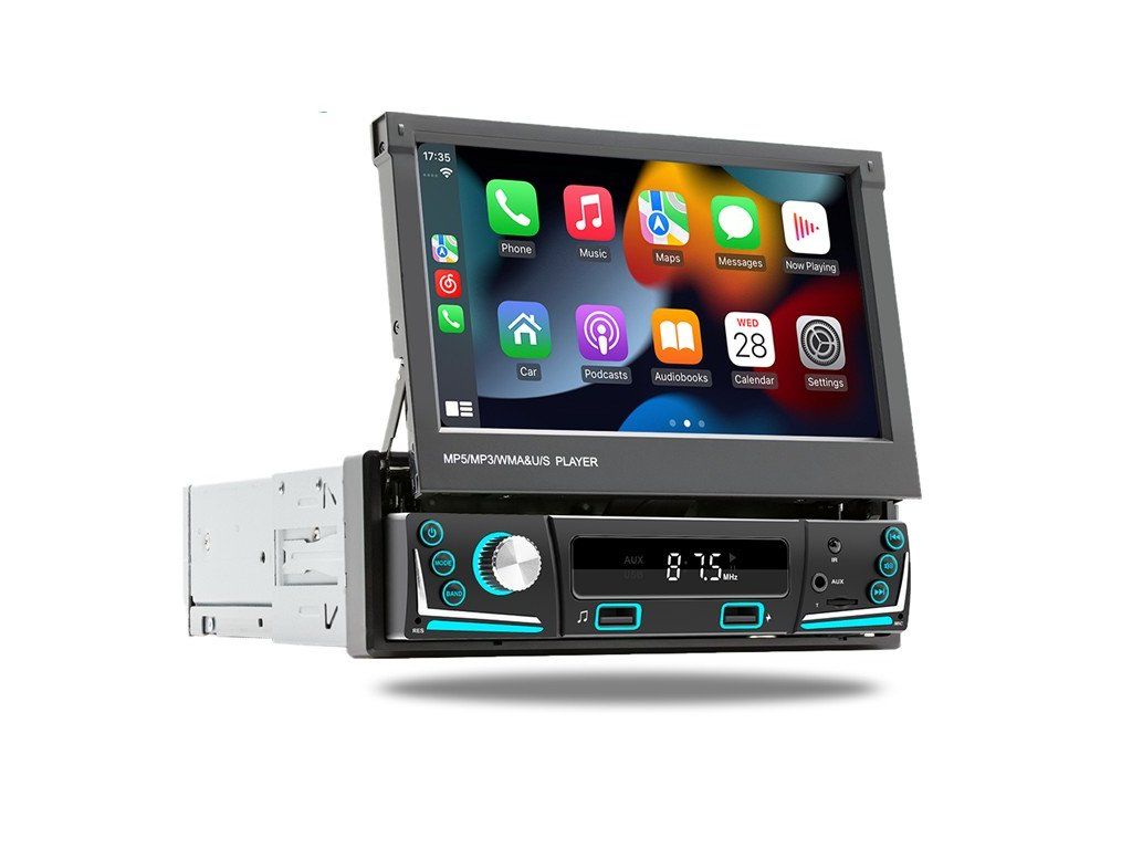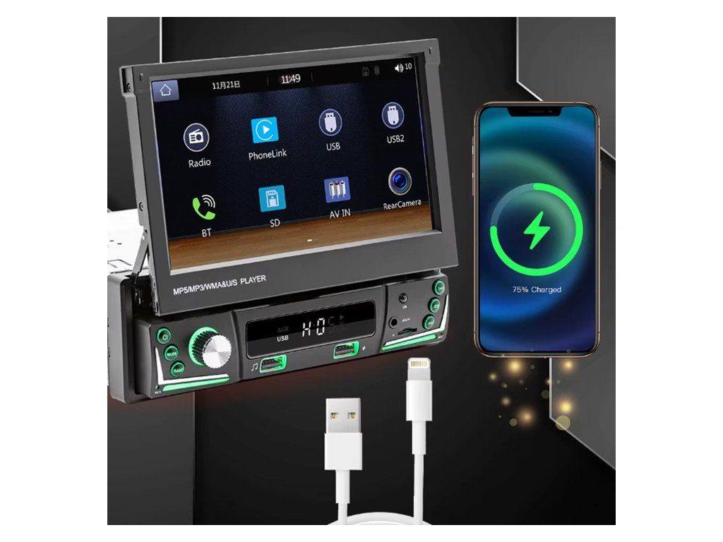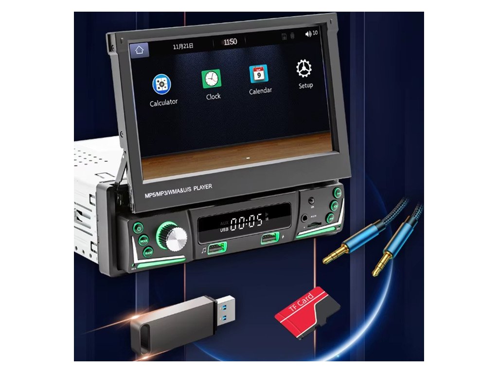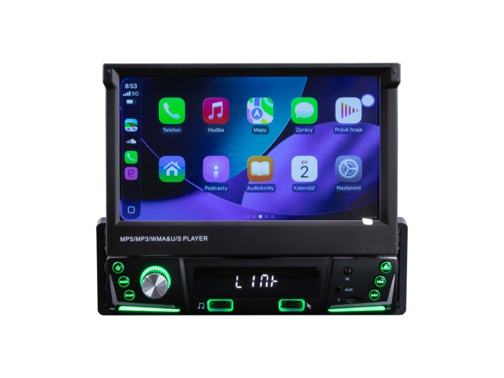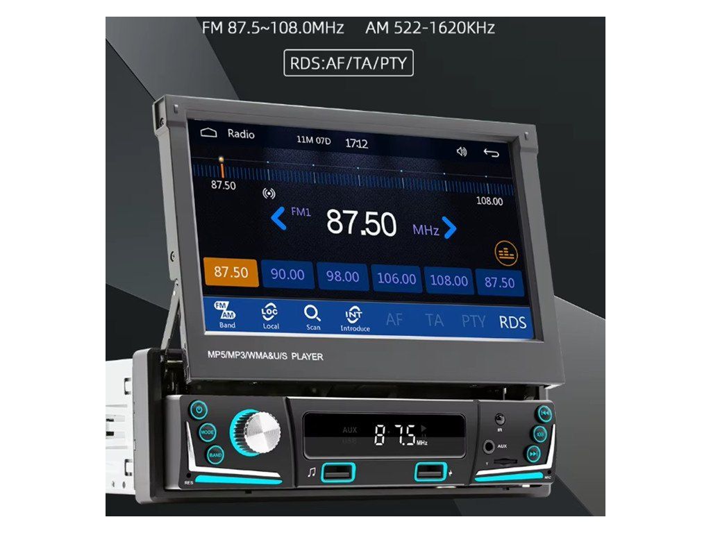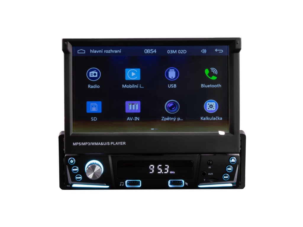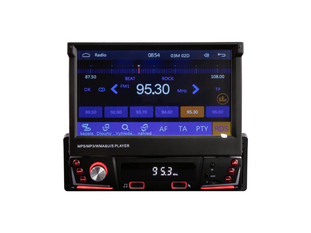 Autorádio s FM / MW, 7" TFT - LCD motoricky vyjíždějícím monitorem a čelním 2x USB.