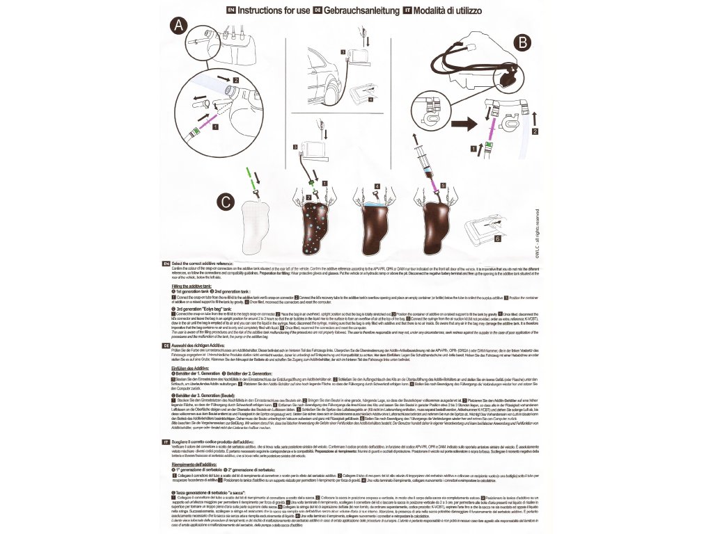 Pracuje se zpravidla zespodu nebo z boku vozidla a po doplnění je nutné nastavení autodiagnostikou. S trochou šikovností a návodem to není nic složitého. Aditivum je použito např. ve vozech značek Citroen, Peugeot, Ford, Volvo, Mazda, Fiat, Mini. Návod zde najdete na stažení.
