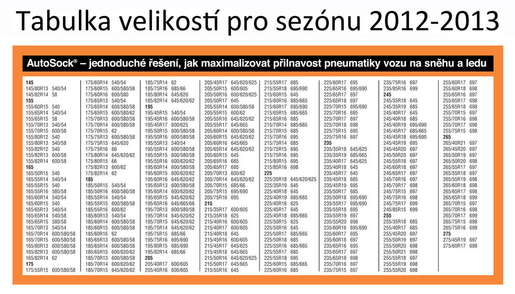 Autosock je unikátní návlek na kola z nově vyvinuté textilní tkaniny. Je snadným a rychlým řešením, aby Vás už nikdy sníh a led nepřekvapil. Nabízíme široký rozsah velikostí, které padnou takřka na všechny kola. Nabízíme i varianty pro nákladní automobily. Nemusíte se bát poničení - AutoSock je šetrnější, než řetězy. Navíc je schválen největšími automobilkami světa a držitelem významných ocenění a atestů včetně uznávaného TÜV.