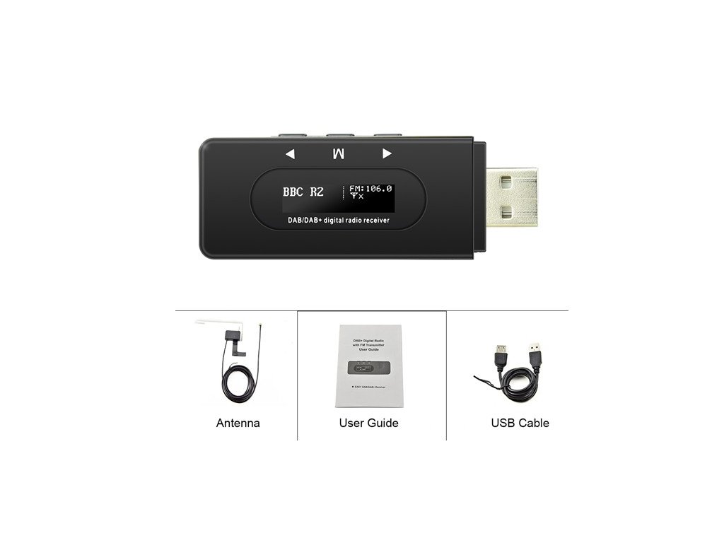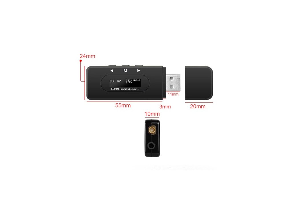 DAB přijímač přes FM modulátor / AUX výstup, napájení USB-A