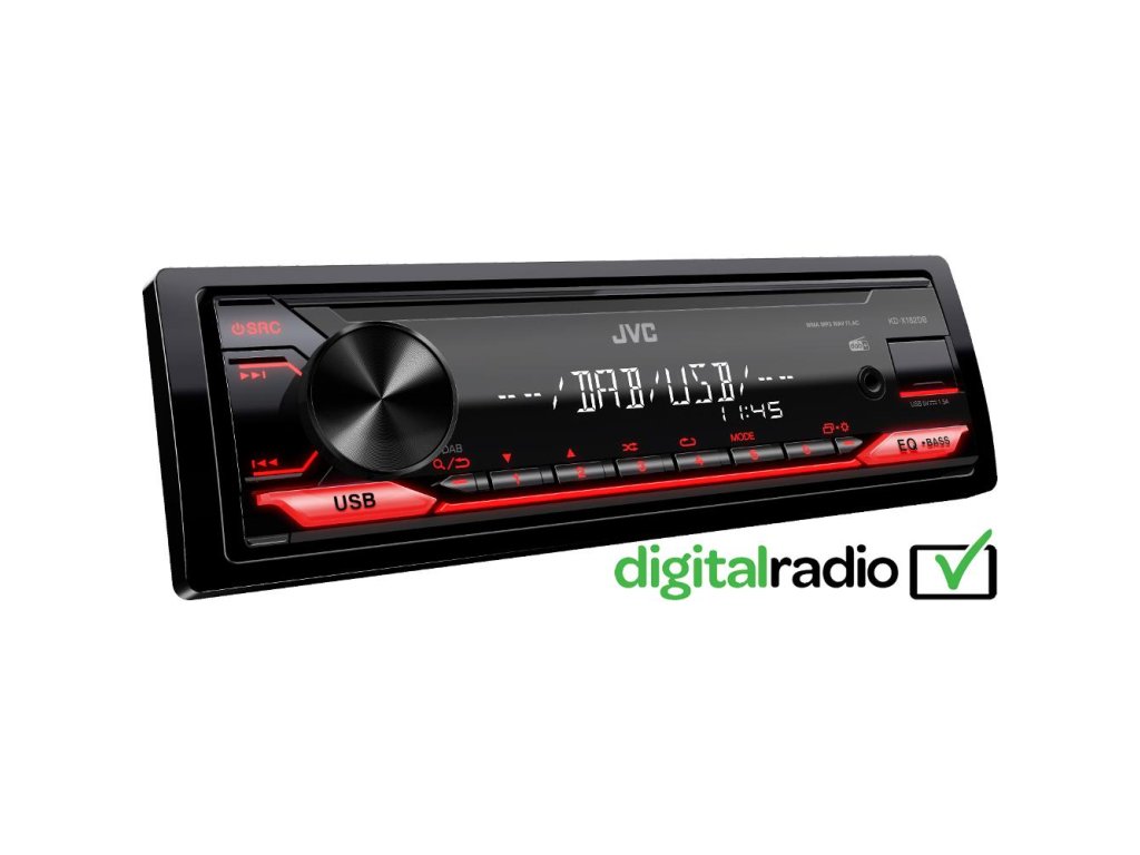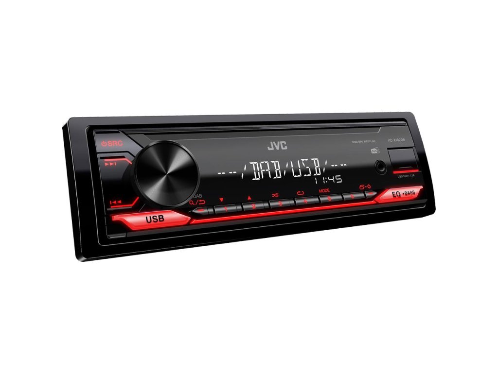 JVC DAB+ / FM autorádio bez mechaniky/USB/AUX/červené podsvícení/odnímatelný panel