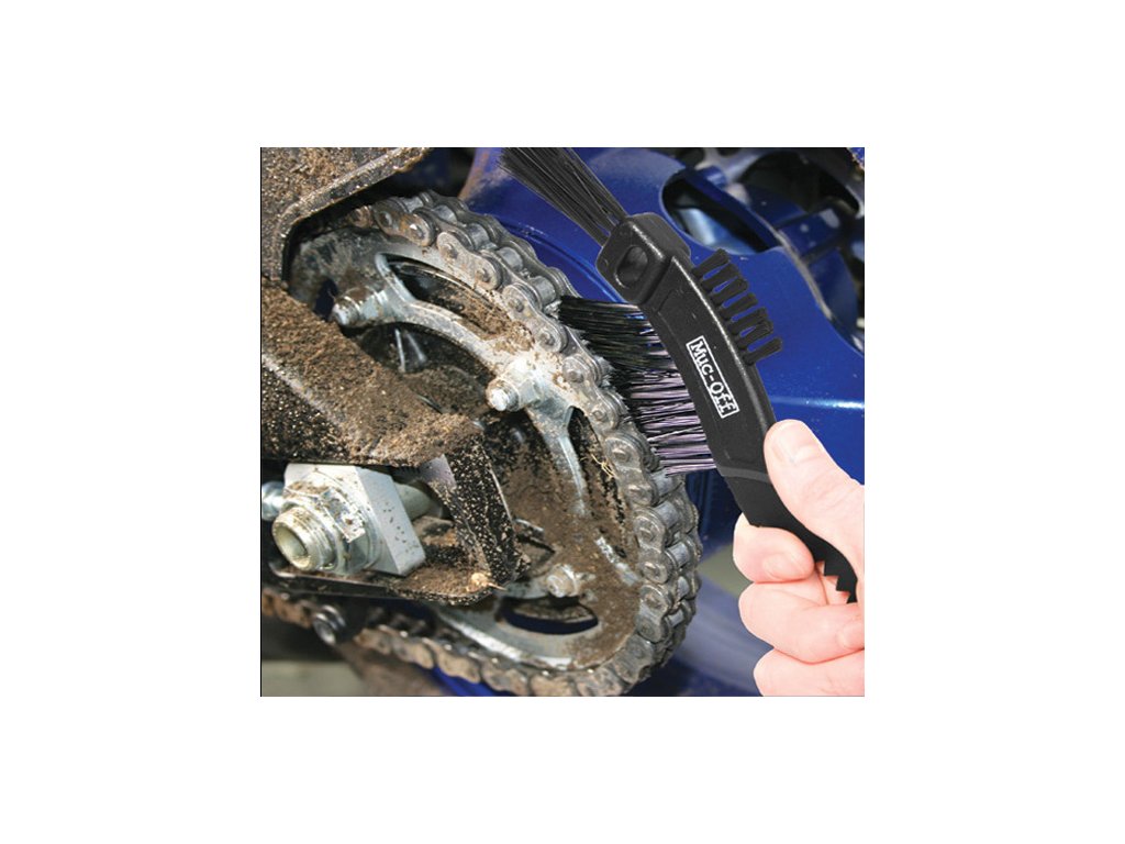 oboustranná použitelnost madla i štětin umožňuje jednoduché čištění i tuhé \"zažrané špíny\" okolo zadní rozety, článků řetězů nebo převodů