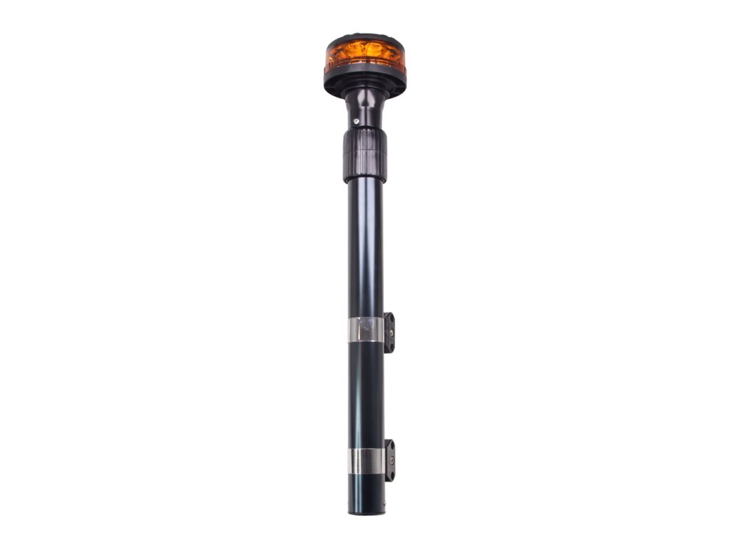 Oranžový LED maják s výrazným výstražným efektem, speciální optika (čočky) s teleskopickou tyčí, určen pro montáž na motocykl. Vršek majáku černý plast.
