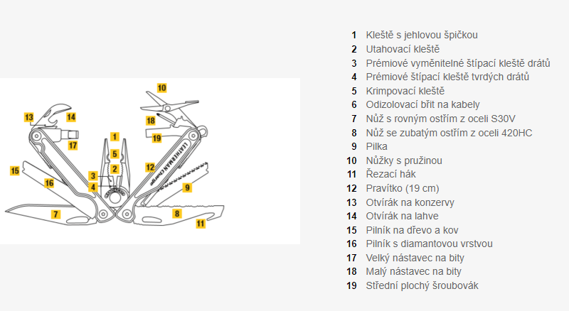 Leatherman Charge Plus TTi je jedním z nejoblíbenějších multitoolů kvůli 19 funkčním nástrojům (mezi které patří nože, pilka, řezací hák, pilník, šroubováky či otvíráky), ale také díky lehkým a extra odolným materiálům, ze kterých je konstruován. Nástroj s označením Plus byl nově obohacen o vyměnitelné břity kleští, díky čemuž zůstává multitool jako nový i po mnoha letech usilovného užívání.Balení obsahuje: multitool, pouzdro nylonové pouzdro se 4 kapsami, odnímatelnou kapesní sponu, kroužek na karabinu, sadu přídavných bitů: Křížový bit PZ1 a PZ2, imbus 1,5 mm, 2mm, 2,5 mm, 3 mm, 4 mm, 5 mm, torx 10, 15, 20, 25, plochý bit 1/8 a 3/32, samolepku 100% originál, návod PARAMETRYDélka čepele: 7.37 cmDélka zavřeného nástroje: 10 cmHmotnost: 252 g NÁSTROJE?????? Kleště s jehlovou špičkou Utahovací kleště Prémiové vyměnitelné štípací kleště drátů Prémiové štípací kleště tvrdých drátů Krimpovací kleště Odizolovací břit na kabely Nůž s rovným ostřím z oceli S30V Nůž se zubatým ostřím z oceli 420HC Pilka Nůžky s pružinou Řezací hák Pravítko (19 cm) Otvírák na konzervy Otvírák na lahve Pilník na dřevo a kov Pilník s diamantovou vrstvou Velký nástavec na bity Malý nástavec na bity Střední plochý šroubovák