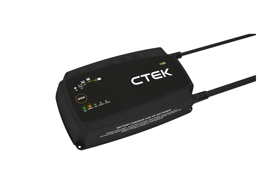 Jedná se novou verzi nabíječky M300 (již není k dostání), která nabízí spoustu vylepšení. Jde o plně automatickou osmikrokovou nabíječku, řízenou mikroprocesorem. Nabíjecí proud je 25 A. Je určena pro 12 V baterie od 40 do 500 Ah. CTEK M25 je 12V nabíječka ideální pro použití na lodích a v karavanech. Je vhodná pro nabíjení a udržování olověných baterií všech druhů včetně AGM, GELových a Lithiových baterií. 4m dlouhý připojovací kabel je navíc zakončen i teplotním čidlem, díky němuž dokáže CTEK M25 efektivně regulovat parametry nabíjení. K další výbavě patří režimy „RECOND“ pro regenerování hluboce vybitých akumulátorů. M25 může zůstat libovolně dlouho připojen, přičemž baterie udržuje v nejlepší možné kondici. Stačí tlačítkem zvolit požadovaný režim.