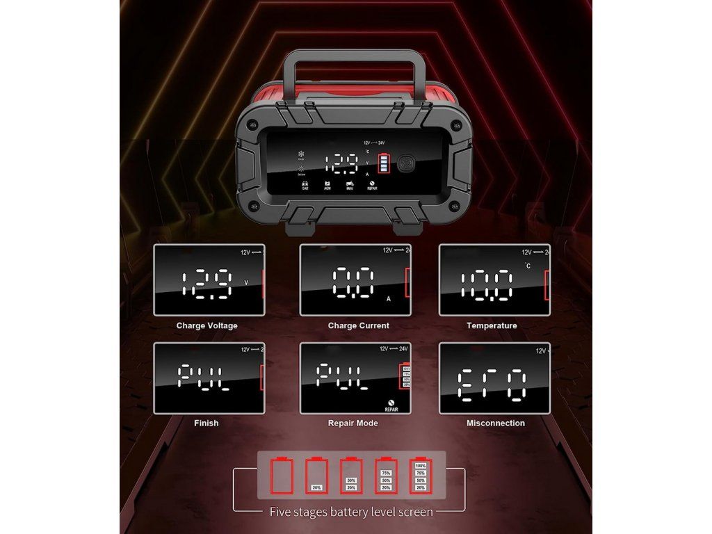 Inteligentní plně automatická 7-stupňová nabíječka 12 V / 24 V 10 A – pro olověné, AGM, GEL a LiFePO₄ baterie. Spolehlivá a výkonná automatická nabíječka s možností nabíjení 12 V nebo 24 V baterií. Ideální pro osobní i užitková vozidla, motorky, lodě, karavany, solární systémy nebo záložní napájení. Nabíječka je vybavena inteligentním systémem řízení nabíjení, který zajišťuje bezpečné a efektivní nabíjení bez přebíjení.