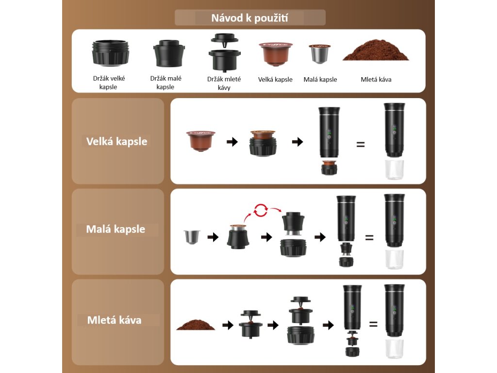 Milujete kvalitní kávu i mimo domov? Tento kompaktní a výkonný přenosný kávovar vám umožní vychutnat si plnohodnotné espresso na cestách, v kanceláři, při kempování i doma. Díky kompatibilitě s kapslemi Nespresso®, Dolce Gusto® i mletou kávou nabízí maximální flexibilitu a jednoduché použití.