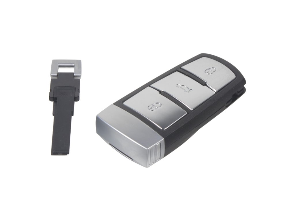 Náhradní autoklíč s dálkovým ovladačem pro vozy koncernu VW. Součástí klíče je planžeta, dálkové ovládání centrálního zamykání se třemi tlačítky a čip ID48 pro imobilizér. Planžetu klíče je třeba nechat vyfrézovat podle tvaru originálního klíče, vyřezaný klíč s čipem je nutno naprogramovat do řídící jednotky vozu a dálkové ovládání je třeba spárovat s komfortní jednotkou vozu.
