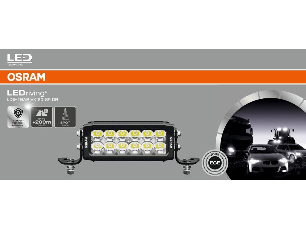LEDriving Lightbar VX180-SP DR je účinným a efektivním doplňkem vašeho vozidla a lze jej připevnit na osobní a nákladní vozidla, zemědělské stroje, užitková vozidla, stavební vozidla, karavany, terénní vozidla a čtyřkolky (1).