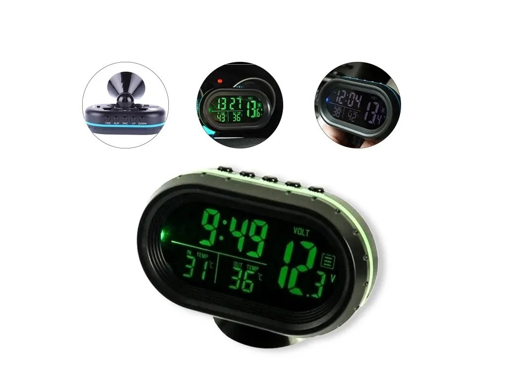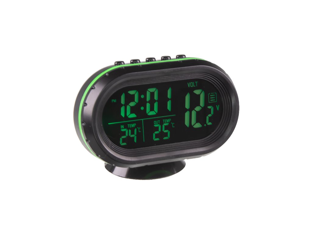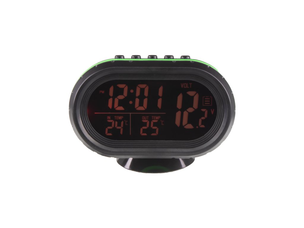 Digitální teploměr pro zobrazování vnitřní a vnější teploty, hodiny a palubní napětí / voltmetr se zeleným/oranžovým podsvětlením.