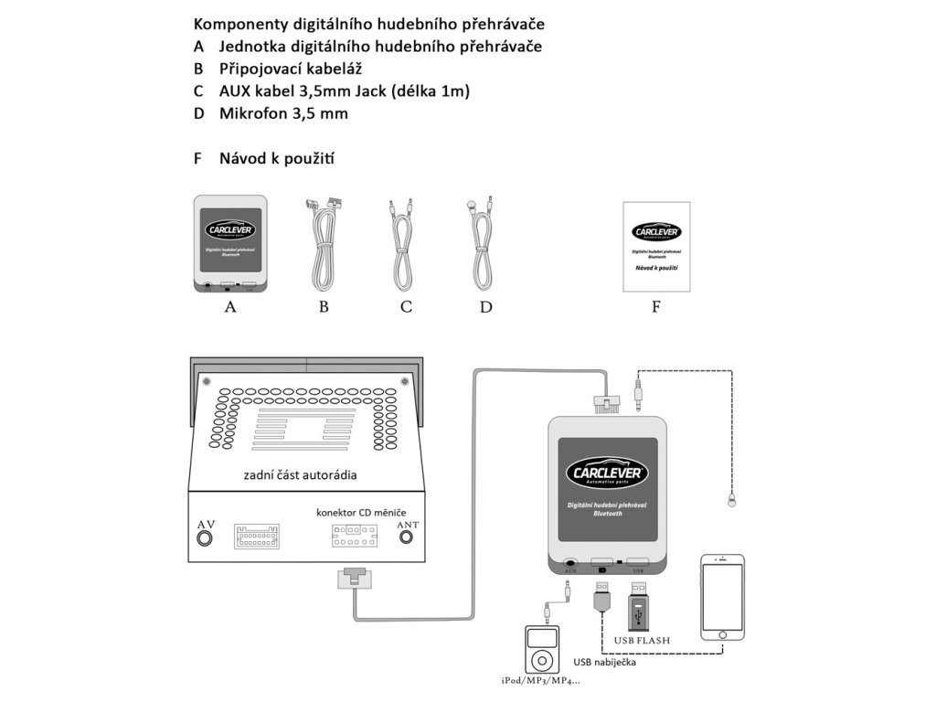 Adaptér je ideální alternativou originálního CD/DVD/USB přehrávače a hands free sady!