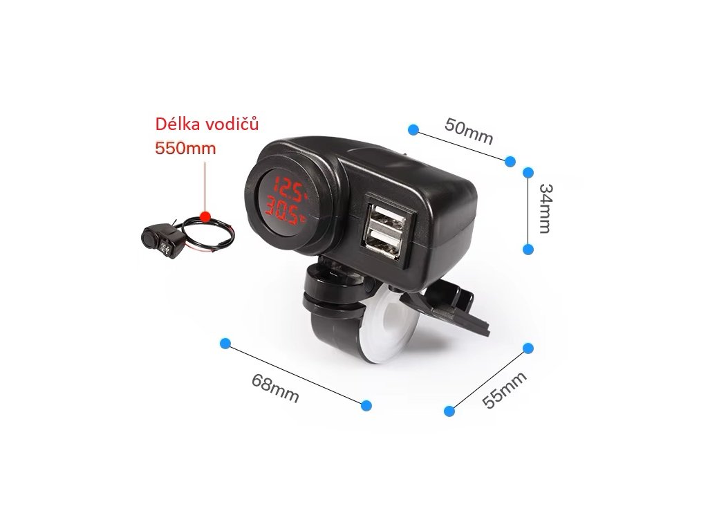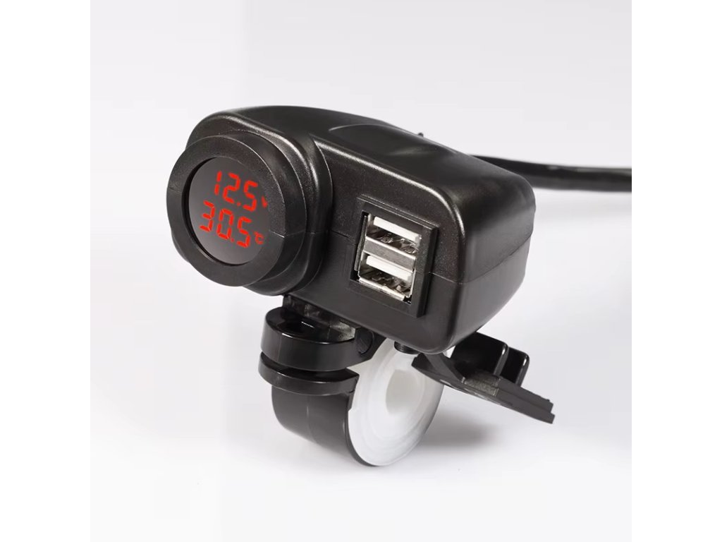 2x USB nabíječka s voltmetrem a teploměrem, vhodné např. pro motocykly, čtyřkolky a jiné.