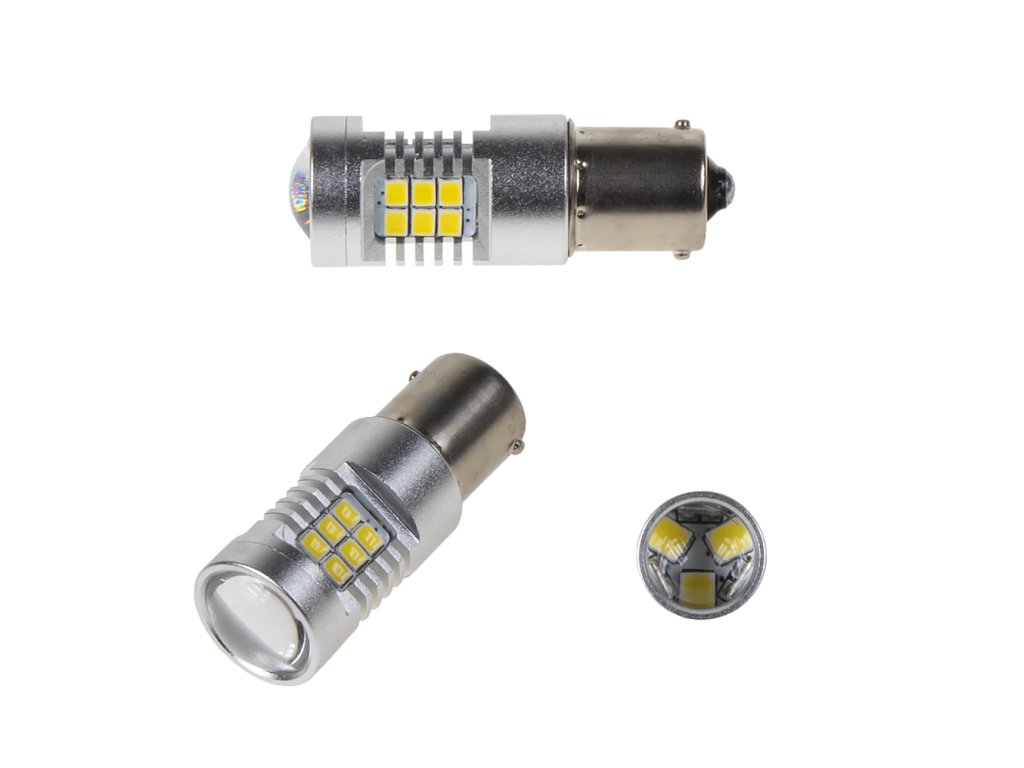 Nová generace LED autožárovek s paticí BA15S (P21W), bílá, 21x super svítivý LED čip 2835SMD + rozptylová krycí čočka.