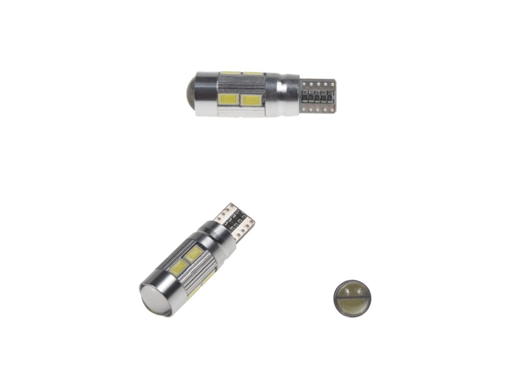 Náhradní LED žárovka s paticí T10, 10x super svítivá SMD LED 5630 + krycí čočka, s vestavěným rezistorem (nehlásí závady řídící jednotky na žárovce u nových vozidel), vhodná do parkovacích světel u novějších vozidel, odpovídá žárovce "celosklo" W5W. Svítivost LED diody je podstatně větší než u žárovky 12 V 5 W. Díky teplotě světla 6000 K jsou LED žárovky ideálním doplňkem do reflektorů s xenonovými výbojkami, kde žluté světlo obyčejné žárovky působí rušivě.