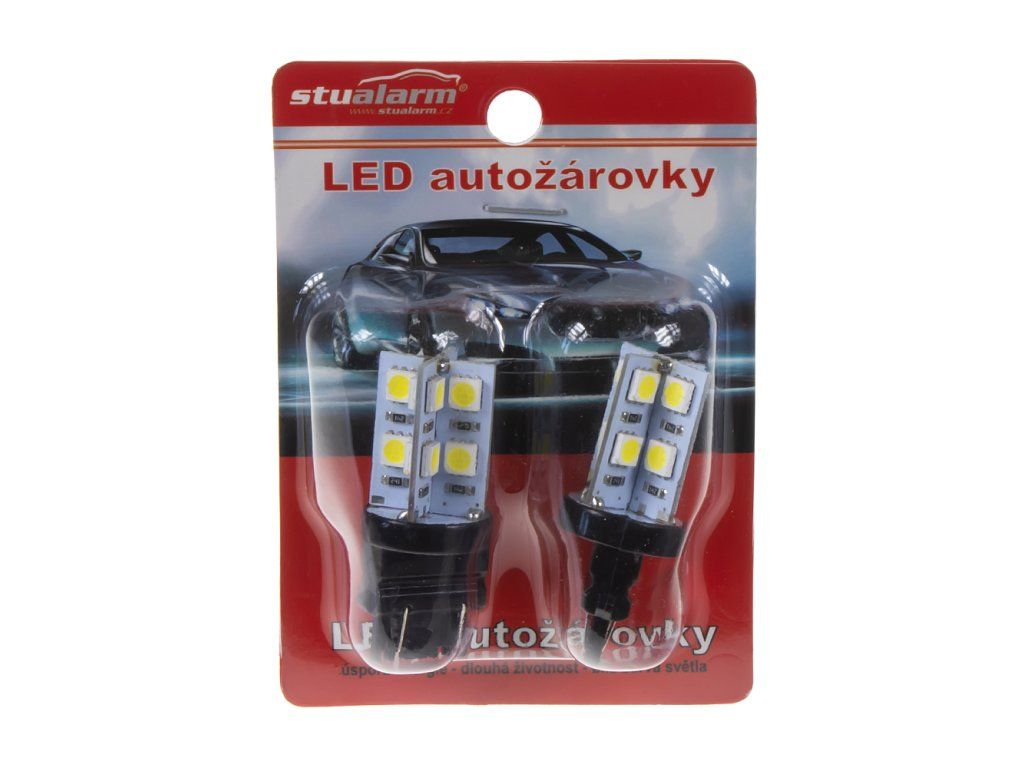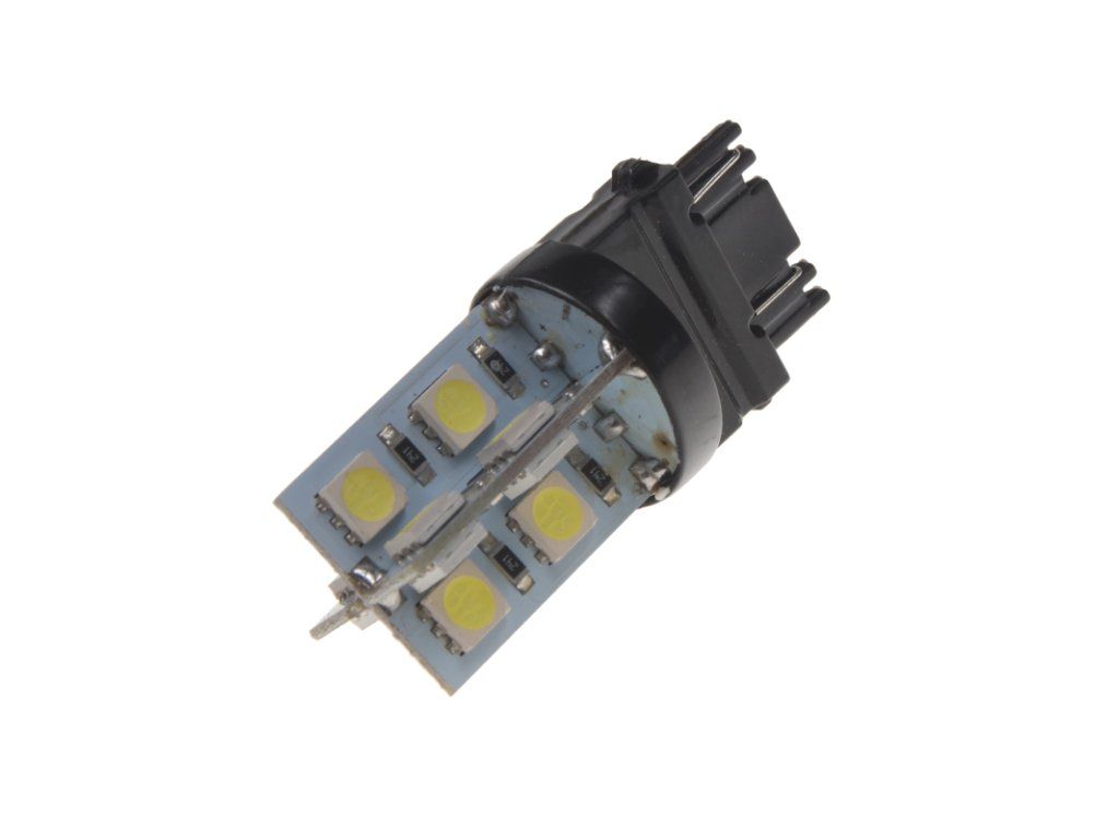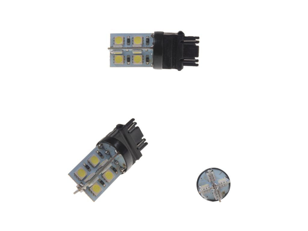 Náhradní LED žárovka s paticí T20 (3157 - W2,5x16d ), dvouvlákno, bílá, s vestavěným rezistorem (nehlásí závady řídící jednotky na žárovce u nových vozidel), 16x vysocesvítivé 3-čipové SMD LED diody. Tato žárovka se používá především v automobilech dovezených z USA automobilky Dodge, Ford, Chrysler.