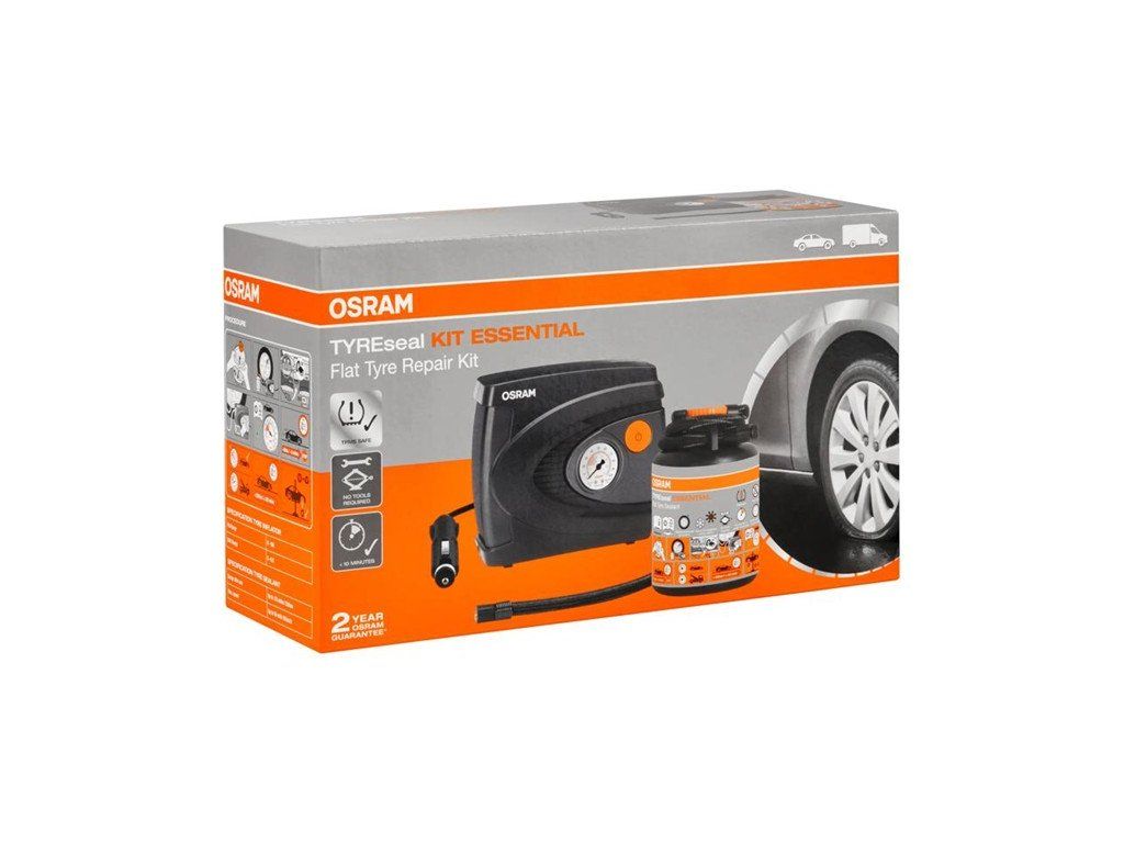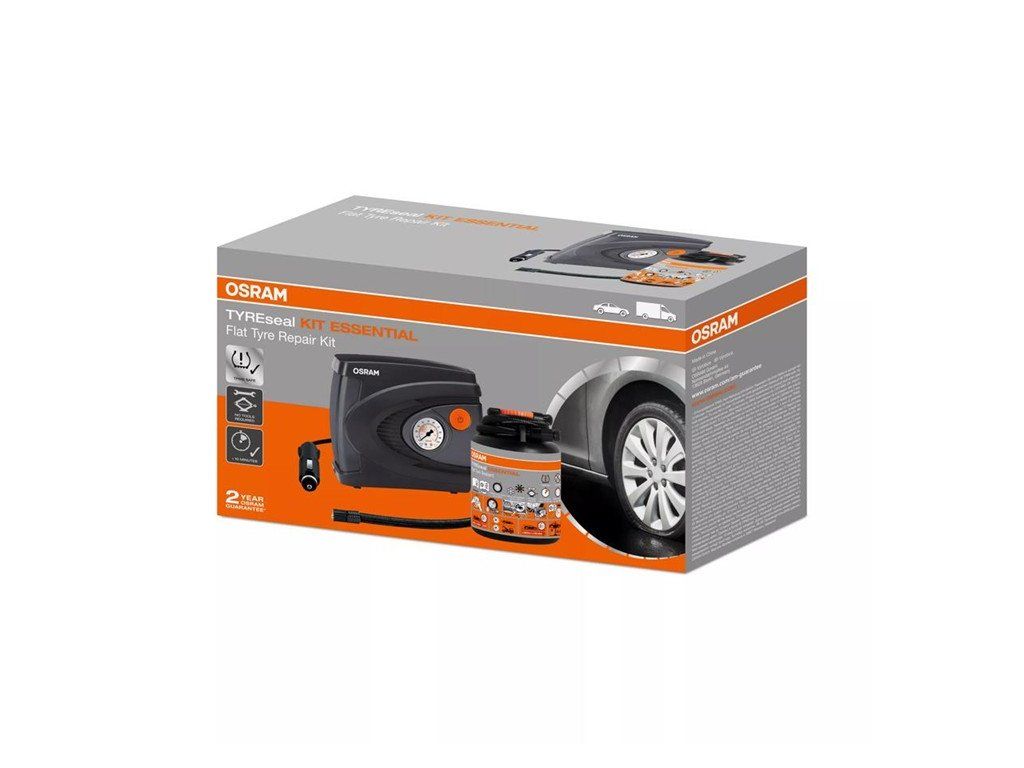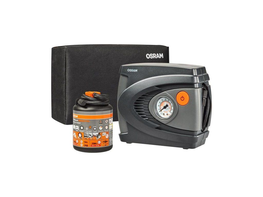 OSRAM TYREseal KIT ESSENTIAL obsahuje 450 ml lahvičku s těsnicím prostředkem na pneumatiky a prémiový analogový kompresor.