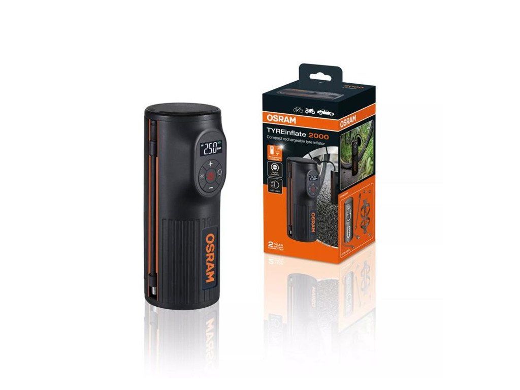 OSRAM TYREinflate 2000 je kompresor na pneumatiky s digitálním podsvíceným displejem pro snadnější a přesnější měření tlaku a nahuštění pneumatik, které zobrazuje hodnoty tlaku v BAR, kPA a PSI.