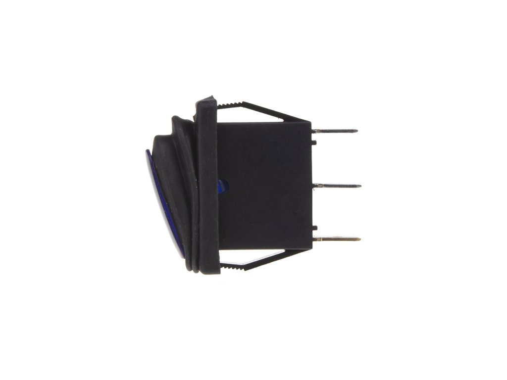 Spínač kolébkový hranatý voděodolný 20 A modrý s podsvícením, napájecí napětí 12V, do otvoru 10 mm x 29 mm. Spíná kladné napětí mezi kontakty 1 a 2, na kontaktu 3 je kostra pro podsvícení. Voděodolnost zajištěna gumovou prachovkou.