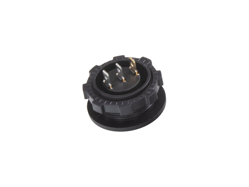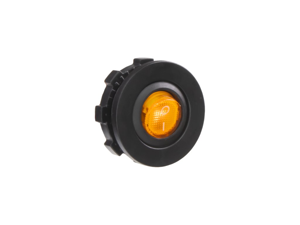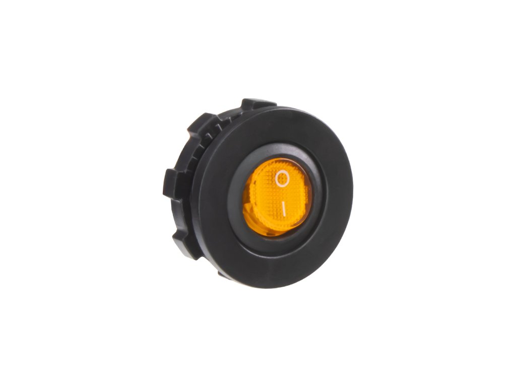 Spínač kolébkový kulatý 20A oranžový s podsvícením. Spíná kladné napětí mezi kontakty 1 a 2, na kontaktu 3 je kostra pro podsvícení.