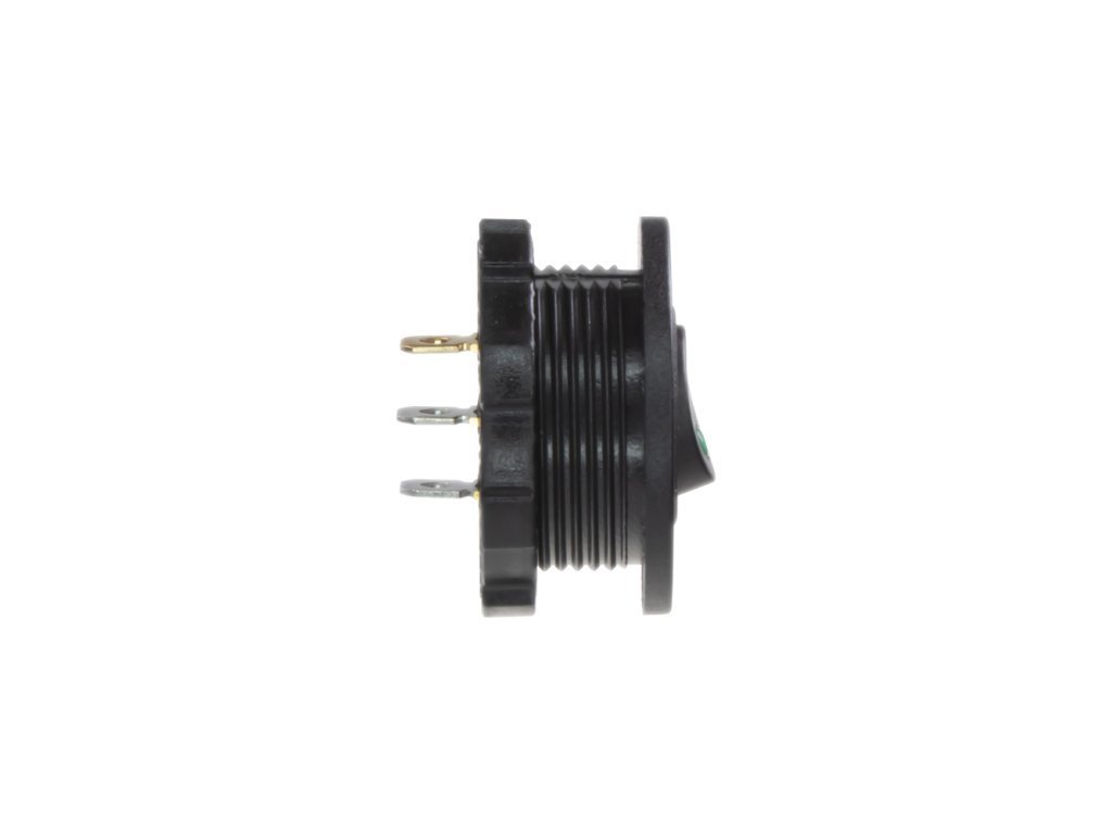 Spínač kolébkový kulatý 20A zelená LED. Spíná kladné napětí mezi kontakty 1 a 2, na kontaktu 3 je kostra pro podsvícení.