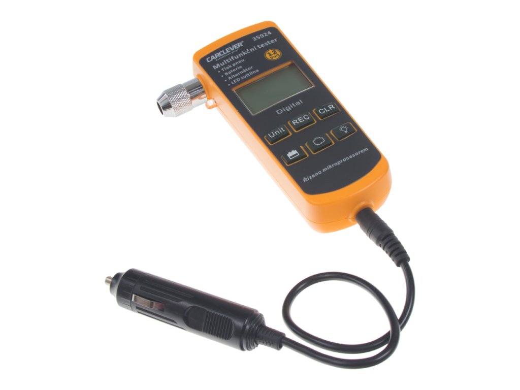 Multifunkční profesionální tester 4v1, praktická kombinace měřiče tlaku v pneumatikách s možností uložení údajů 4 kol, tester baterie, tester alternátoru / nabíjení a příruční lampička.