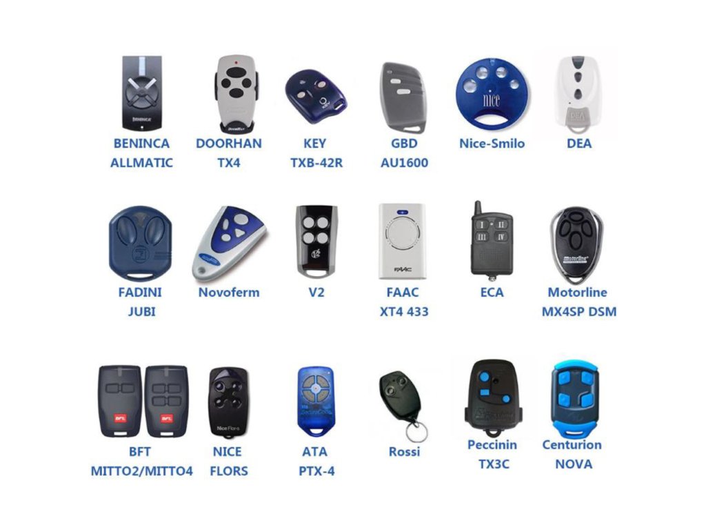 Beninca Allmatic, Doorhan, KEY TXB-42R, GBD AU1600, Nice-Smilo, Nice-Flors, DEA, FADINI JUBI, Novoferm, V2, FAAC XT4, ECA, Motorline MX4SP DSM, BFT MITTO2/MITTO 4, ATA PTX-4, Rossi, Peccinin TX3C, Centurion-NOVA (otevírání garážových vrat, pohony vjezdových bran).