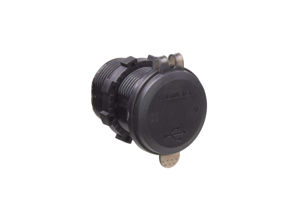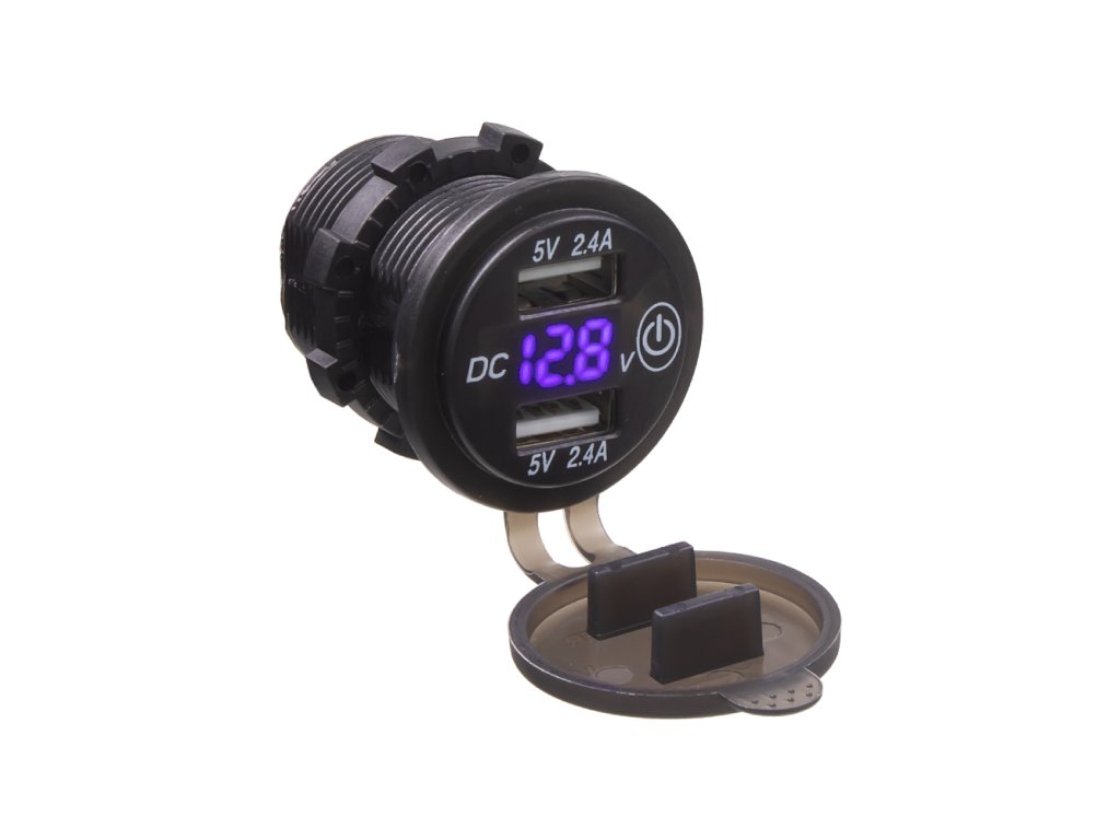 2x USB nabíječka s voltmetrem do panelu, s krytkou proti prachu a vlhkosti, modrý LED displej, dotykový vypínač.
