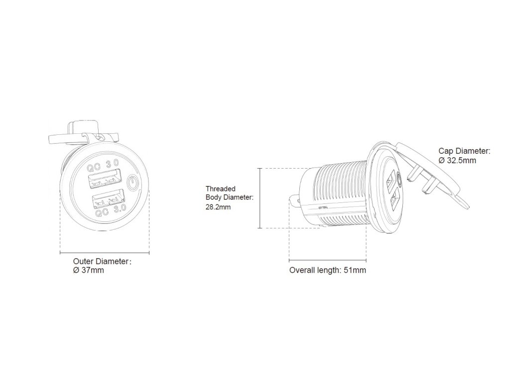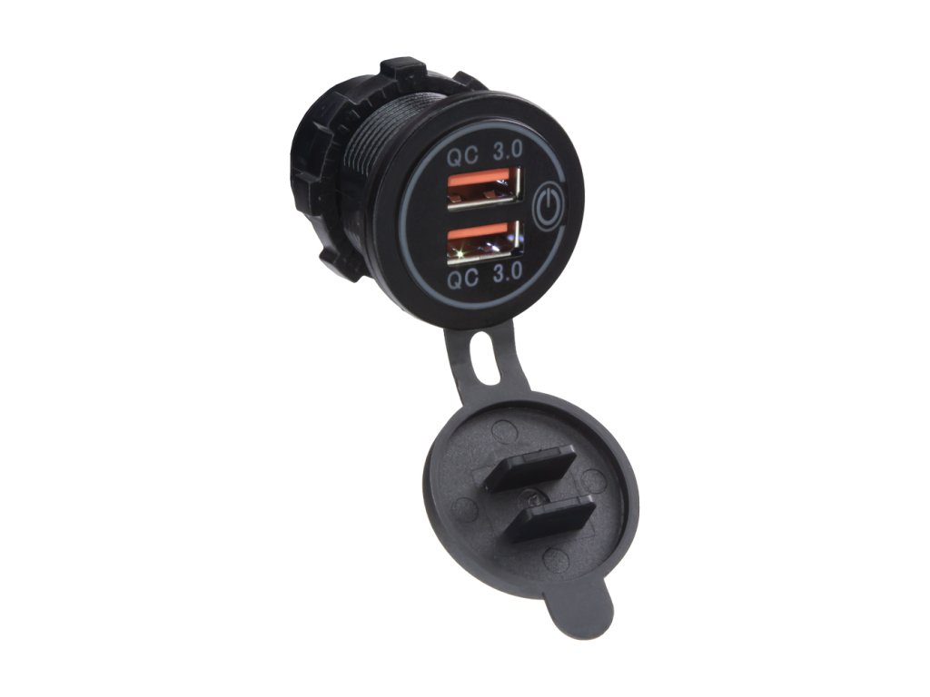 2x USB nabíječka do panelu, QC 3.0, s krytkou proti prachu a vlhkosti, bílé podsvícení a s možností vypnutí / zapnutí USB pouze dotykem.
