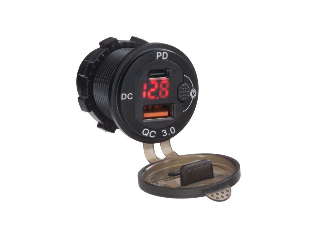 USB nabíječka QC3.0 + USB-C, s voltmetrem s krytkou proti prachu a vlhkosti, červené podsvícení.