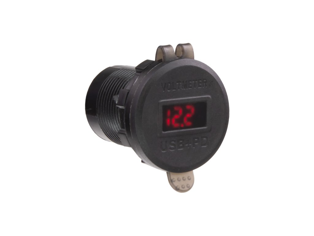USB nabíječka QC3.0 + USB-C, s voltmetrem s krytkou proti prachu a vlhkosti, červené podsvícení.