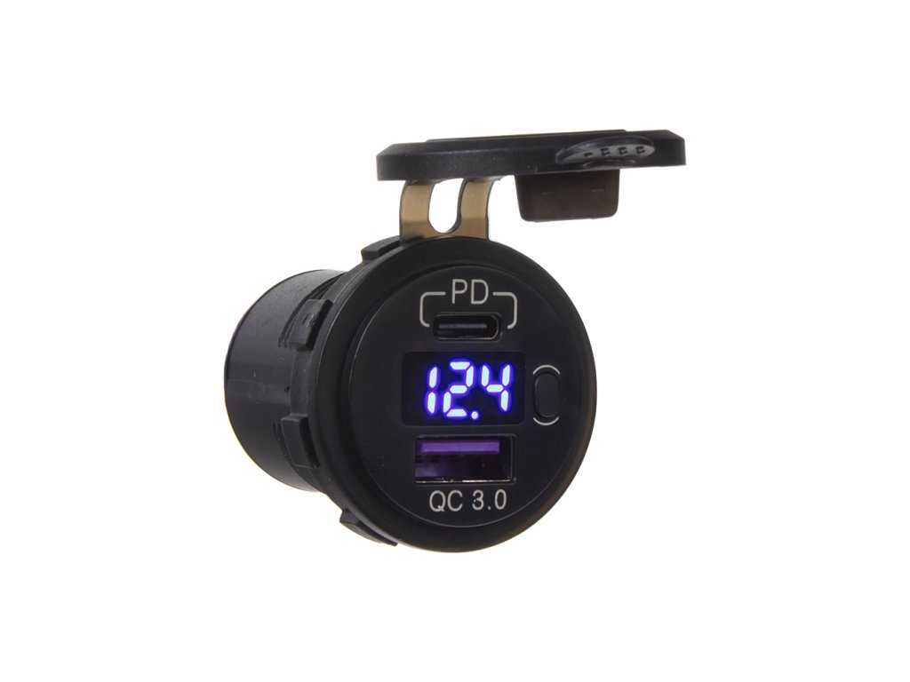 x USB nabíječka QC3.0 + USB-C, digitální voltmetr do panelu