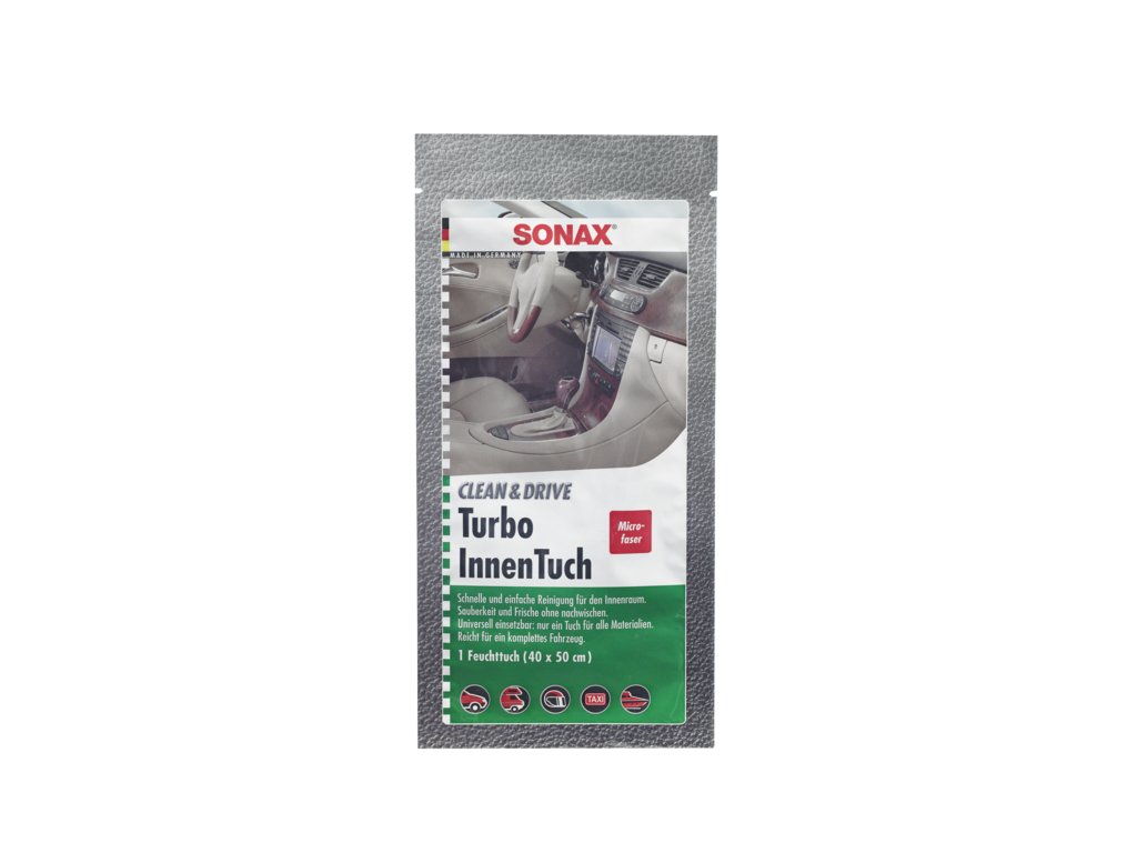 Utěrka na interiér určená pro všechny části interiéru - kokpit, plastové díly, sedačky, polstrování, střechovici, kůži, zrcadla a skla. Toto umožňuje nový dvojitý systém mikrovlákna v kombinaci s vysoce jakostními SONAX ošetřujícími komponenty. Utěrka nezanechává žádné šmouhy a fleky.Vlhká utěrka snadno, rychle a lehce odstraňuje nečistoty, prach, fleky, mastnoty v interiéru bez vody a bez dalšího sušení. Nejprve ošetřit skleněné plochy a pak ostatní části interiéru.
