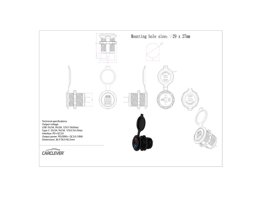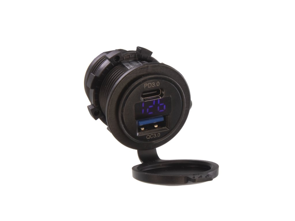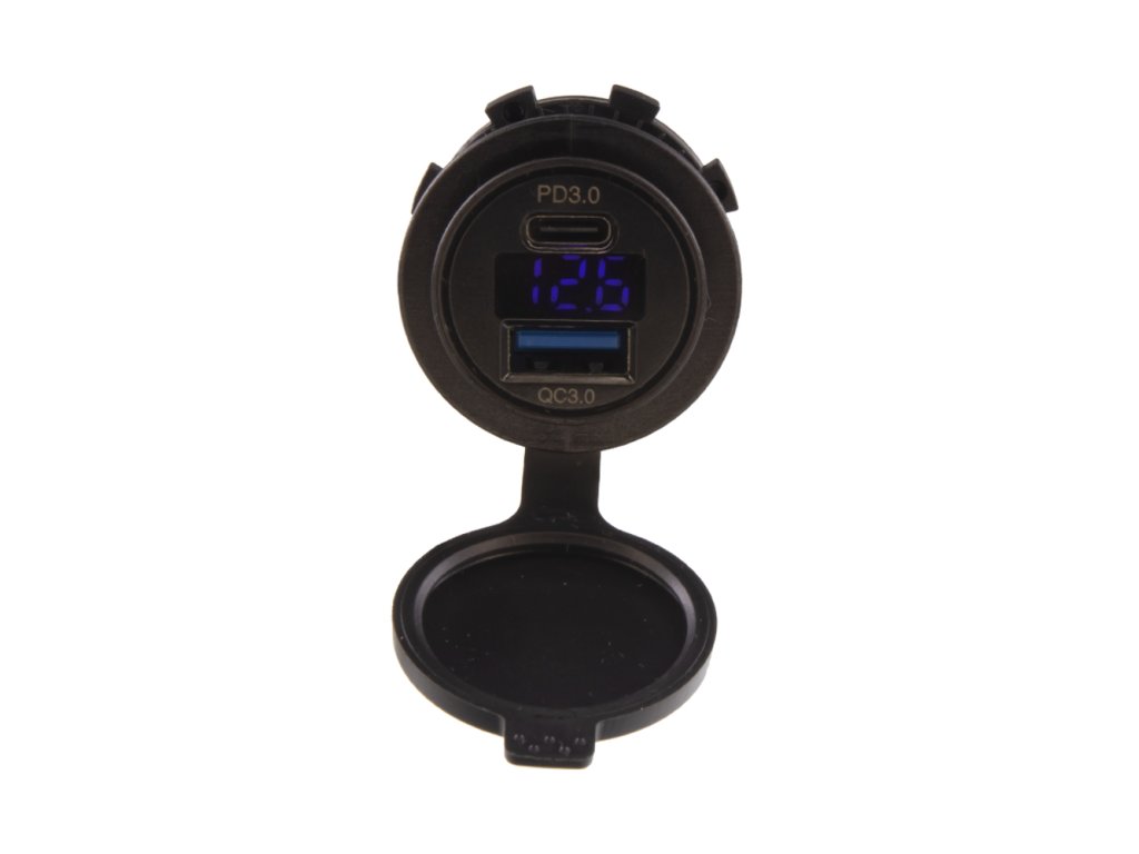 USB nabíječka do panelu, QC3.0 + USB-C, s voltmetrem a s krytkou proti prachu a vlhkosti.