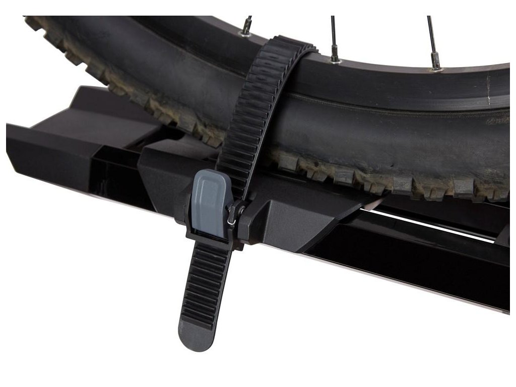 Přichytíme zadní kolo utažením bezpečnostního plastového řemínku v nastavitelném držáku.